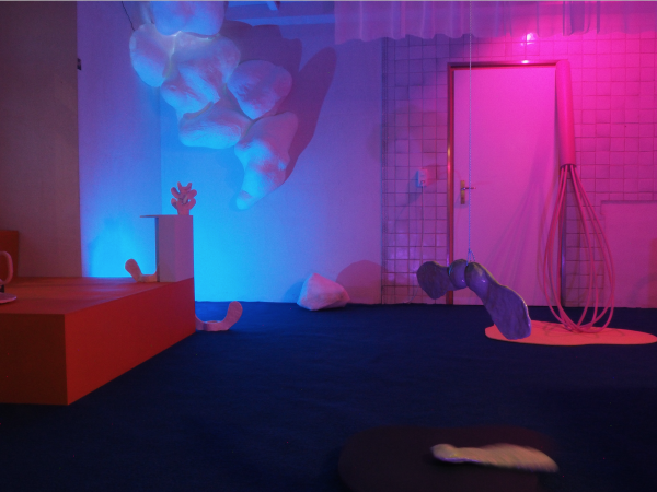 Das Eck wird zur Bühne für Dinge. Auf dieser Bühne ereignet sich Surreales. Ein Löffel, unifarbig, riesengross, handgeformt und dadurch universell, eine Tasse ebenso, ein orangener Blob und felsenförmige Hohlobjekte aus Papiermaché treiben ihr Unding und kreieren eine eigene (Atmo)-Sphäre.